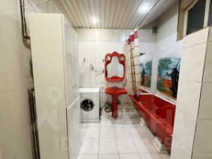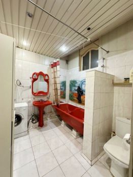 Просторный совмещённый санузел с кафельной плиткой и красной сантехникой