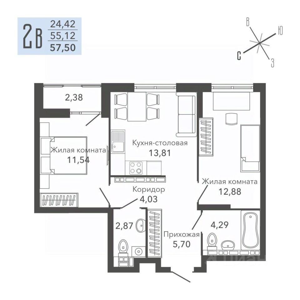 Общая площадь57,5 м²