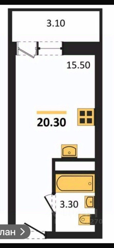 Квартира - студия с отделкой "под ключ": натяжной потолок, ламинат, обои, плитка в санузле (унитаз, раковина).
