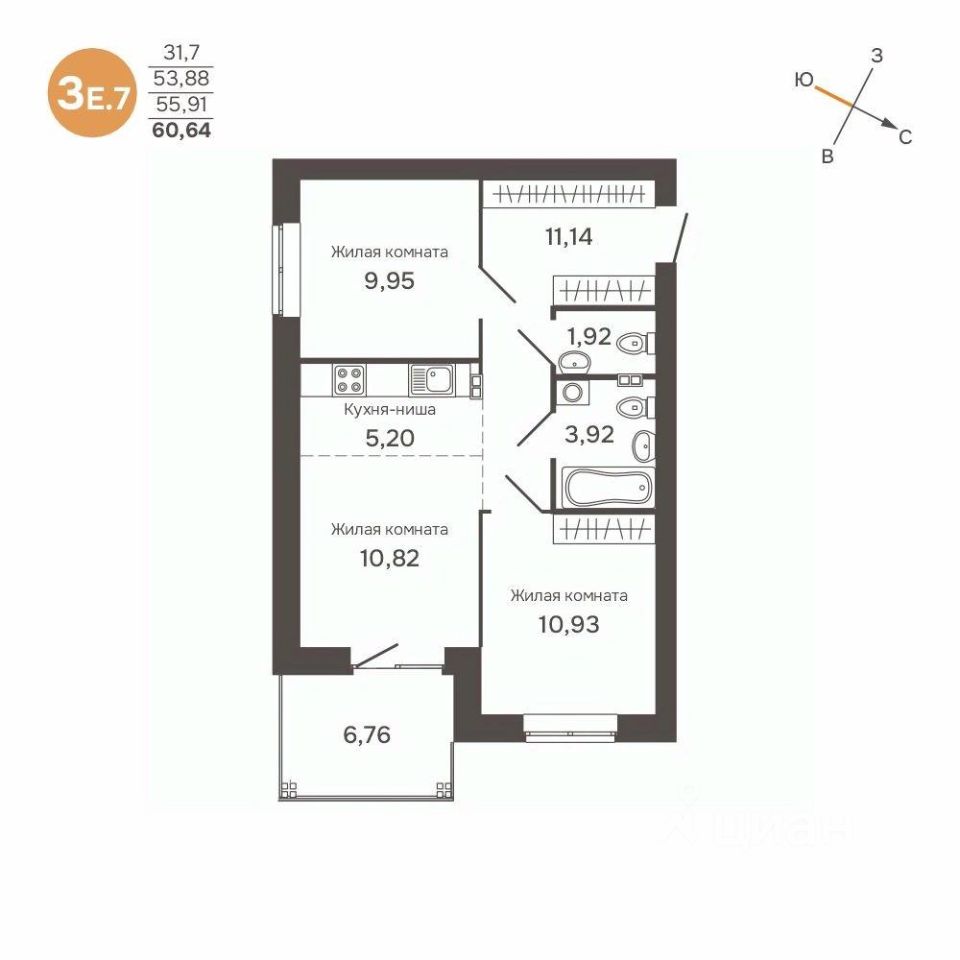 Общая площадь55,91 м²