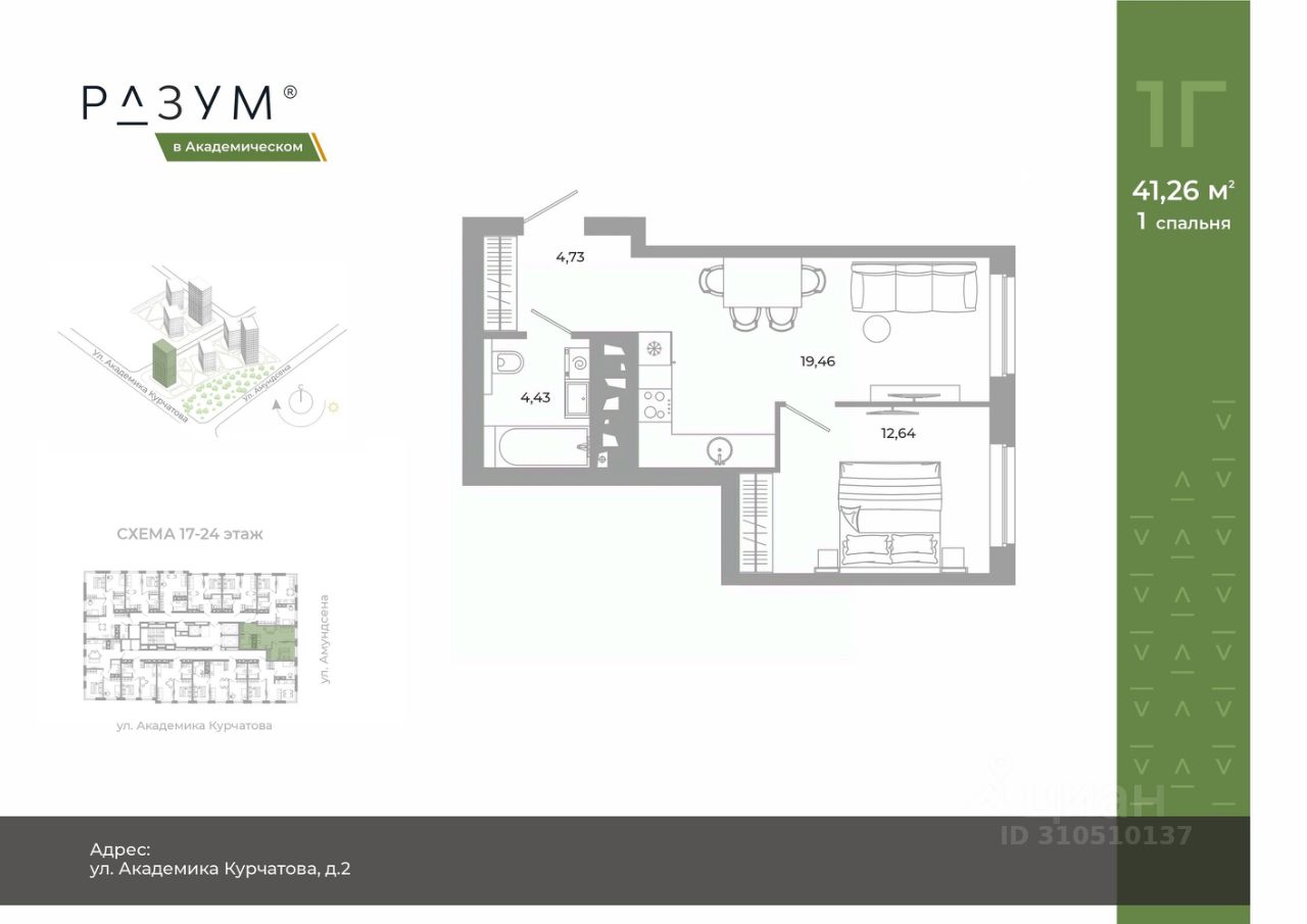 "РАЗУМ в Академическом" — это жилой комплекс из 7 домов переменной этажности от федерального девелопера "РАЗУМ" с 12-летним опытом создания жилых проектов. Дома от 12 до 24 этажей расположены в границах ул. Амундсена. В пешей доступности: - 6 школ; - 10 детских садов; - магазины; - поликлиники; - фитнес-залы. Рядом удобный выезд на ЕКАД. Главная особенность проекта — угловое остекление, которое составляет 22% всей площади. Окна в квартирах установлены в 60 см от пола. Увеличенная площадь остекления помогает снизить затраты на энергоресурсы и создаёт уют в квартире. Сердце жилого комплекса — приватный двор-парк с игровыми комплексами, тренажерами, площадками. "городские грядки" — новое решение благоустройства, где выращиваются ароматные травы или цветы. За пределами комплекса есть прогулочная зона с эко-тропой с вдохновляющими надписями. Прогулки по эко-тропе — это променады наедине с природой. "РАЗУМ в Академическом" — это: - территория без машин; - безбарьерная среда; - единый экостиль в оформлении дворового пространства; - 11 тематических зоны в двор-парке; - многоуровневое освещение и подсветка фасадов; - видеонаблюдение; - гостевой паркинг; - эстетичные подъездные холлы со сквозными подъездами и комфортной зоной ожидания; - Разделенные колясочные и велосипедные зоны; - Велосипедные на 1 этаже; - Кладовые помещения на каждом этаже и на -1 этаже. В проекте 25 планировочных решений: от уютных студий от 21,51 м² до квартир с тремя спальнями и кухней-гостиной до 66,58 м² с функциональным разделением на гостевую и приватные зоны.