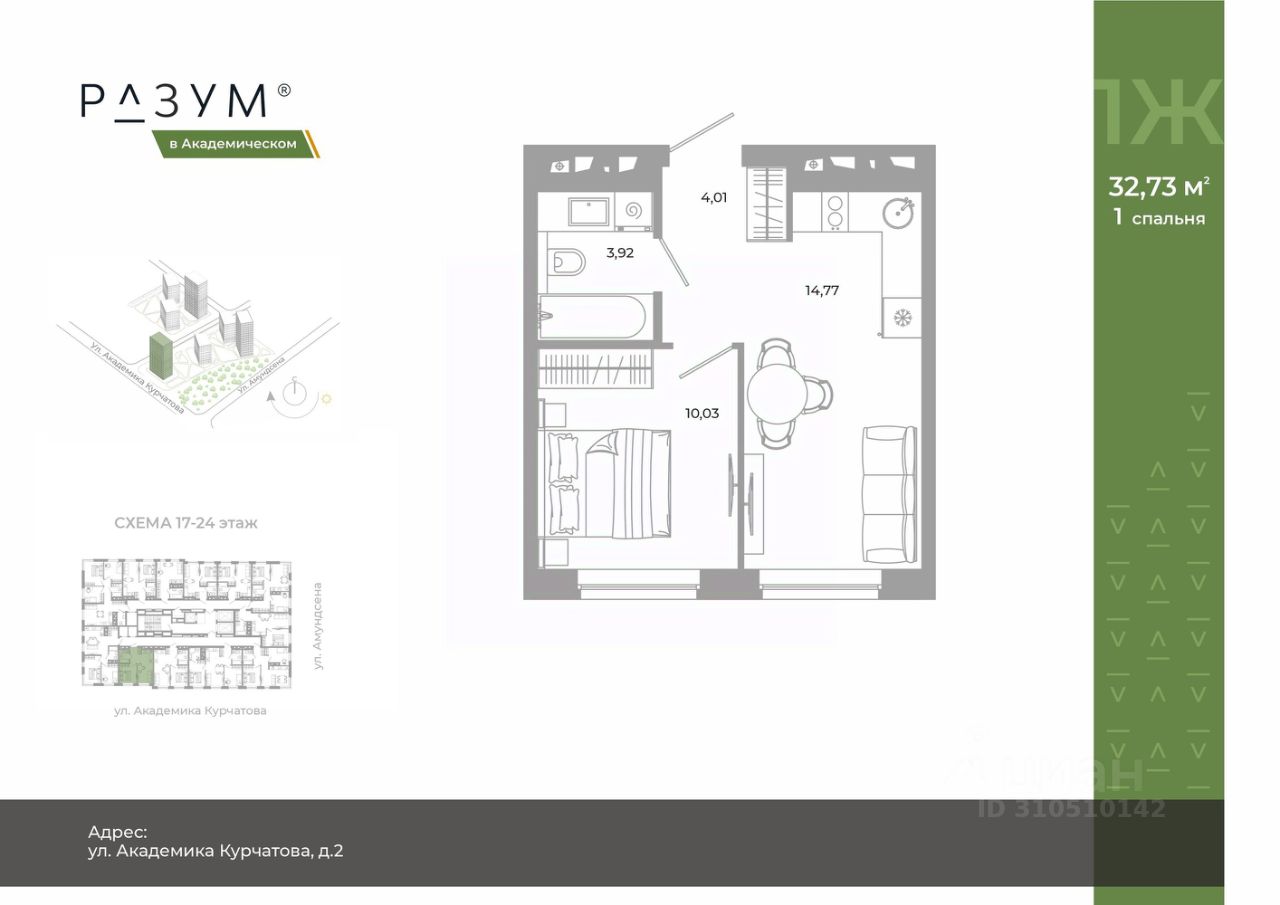 "РАЗУМ в Академическом" — это жилой комплекс из 7 домов переменной этажности от федерального девелопера "РАЗУМ" с 12-летним опытом создания жилых проектов. Дома от 12 до 24 этажей расположены в границах ул. Амундсена. В пешей доступности: - 6 школ; - 10 детских садов; - магазины; - поликлиники; - фитнес-залы. Рядом удобный выезд на ЕКАД. Главная особенность проекта — угловое остекление, которое составляет 22% всей площади. Окна в квартирах установлены в 60 см от пола. Увеличенная площадь остекления помогает снизить затраты на энергоресурсы и создаёт уют в квартире. Сердце жилого комплекса — приватный двор-парк с игровыми комплексами, тренажерами, площадками. "городские грядки" — новое решение благоустройства, где выращиваются ароматные травы или цветы. За пределами комплекса есть прогулочная зона с эко-тропой с вдохновляющими надписями. Прогулки по эко-тропе — это променады наедине с природой. "РАЗУМ в Академическом" — это: - территория без машин; - безбарьерная среда; - единый экостиль в оформлении дворового пространства; - 11 тематических зоны в двор-парке; - многоуровневое освещение и подсветка фасадов; - видеонаблюдение; - гостевой паркинг; - эстетичные подъездные холлы со сквозными подъездами и комфортной зоной ожидания; - Разделенные колясочные и велосипедные зоны; - Велосипедные на 1 этаже; - Кладовые помещения на каждом этаже и на -1 этаже. В проекте 25 планировочных решений: от уютных студий от 21,51 м² до квартир с тремя спальнями и кухней-гостиной до 66,58 м² с функциональным разделением на гостевую и приватные зоны.