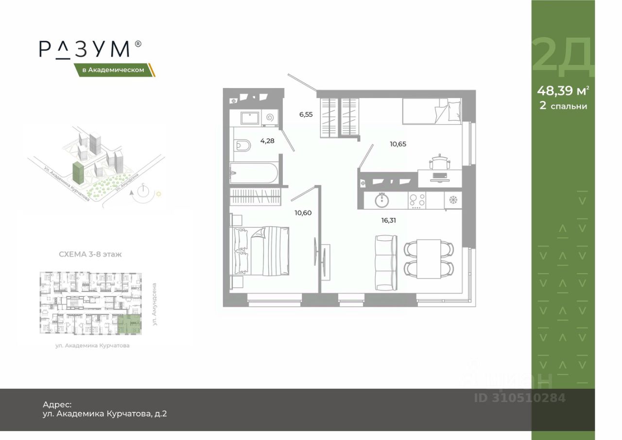 "РАЗУМ в Академическом" — это жилой комплекс из 7 домов переменной этажности от федерального девелопера "РАЗУМ" с 12-летним опытом создания жилых проектов. Дома от 12 до 24 этажей расположены в границах ул. Амундсена. В пешей доступности: - 6 школ; - 10 детских садов; - магазины; - поликлиники; - фитнес-залы. Рядом удобный выезд на ЕКАД. Главная особенность проекта — угловое остекление, которое составляет 22% всей площади. Окна в квартирах установлены в 60 см от пола. Увеличенная площадь остекления помогает снизить затраты на энергоресурсы и создаёт уют в квартире. Сердце жилого комплекса — приватный двор-парк с игровыми комплексами, тренажерами, площадками. "городские грядки" — новое решение благоустройства, где выращиваются ароматные травы или цветы. За пределами комплекса есть прогулочная зона с эко-тропой с вдохновляющими надписями. Прогулки по эко-тропе — это променады наедине с природой. "РАЗУМ в Академическом" — это: - территория без машин; - безбарьерная среда; - единый экостиль в оформлении дворового пространства; - 11 тематических зоны в двор-парке; - многоуровневое освещение и подсветка фасадов; - видеонаблюдение; - гостевой паркинг; - эстетичные подъездные холлы со сквозными подъездами и комфортной зоной ожидания; - Разделенные колясочные и велосипедные зоны; - Велосипедные на 1 этаже; - Кладовые помещения на каждом этаже и на -1 этаже. В проекте 25 планировочных решений: от уютных студий от 21,51 м² до квартир с тремя спальнями и кухней-гостиной до 66,58 м² с функциональным разделением на гостевую и приватные зоны.
