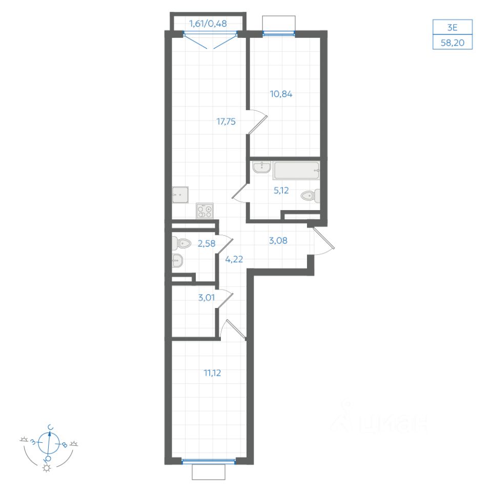 Общая площадь58,3 м²