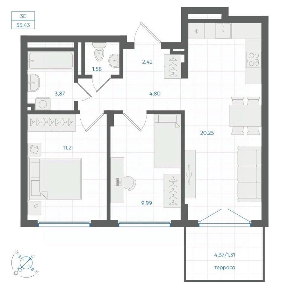 Общая площадь55,43 м²