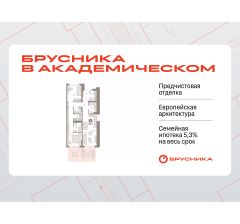 Квартира с кухней-гостиной и двумя спальнями в Бруснике в Академическом. Особенности планировки: второй санузел, гардеробная, окна в пол, вид во двор, отдельный вход, панорамное остекление, разнесённые спальни, предчистовая отделка, мастер-спальня, терраса, постирочная.
