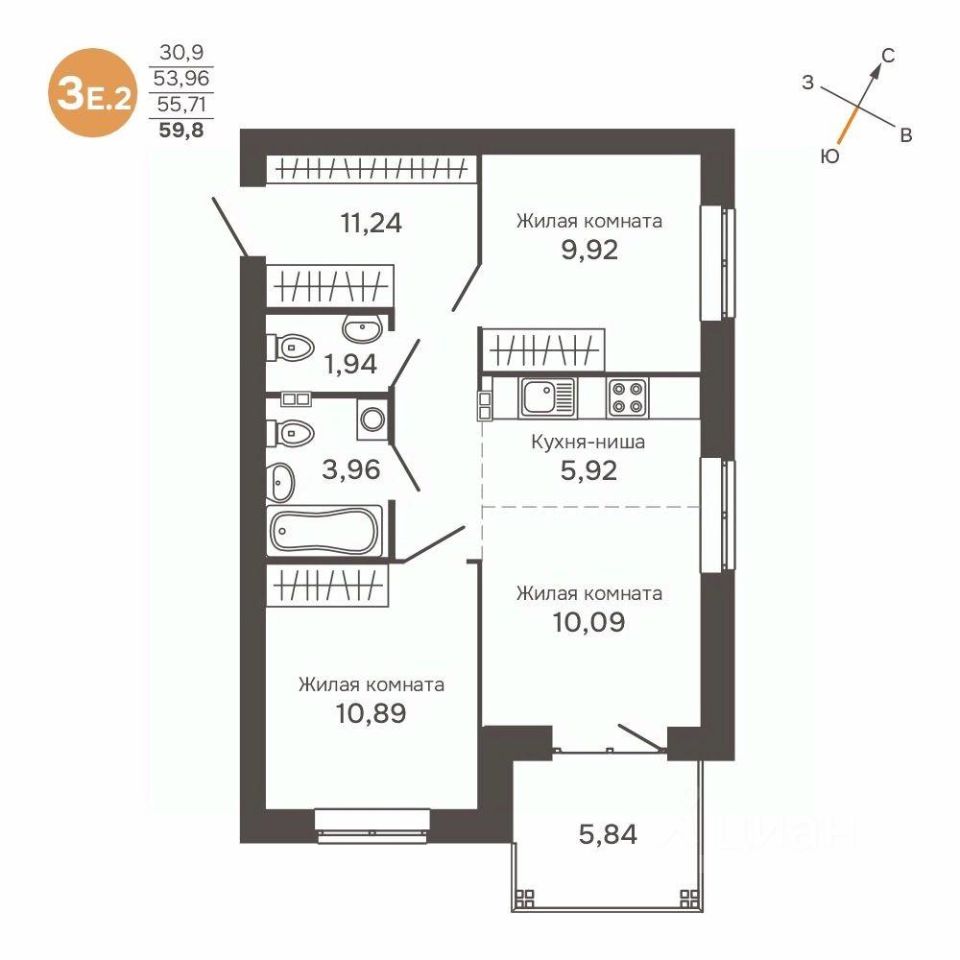 Общая площадь55,71 м²