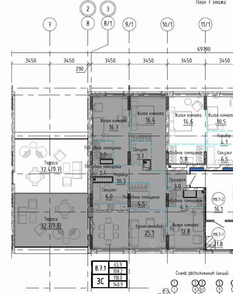 Квартира расположена на последнем этаже, 3м потолки. Есть огромная терраса.