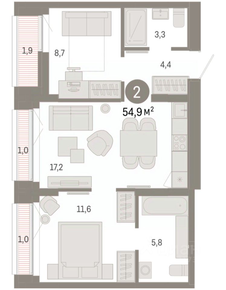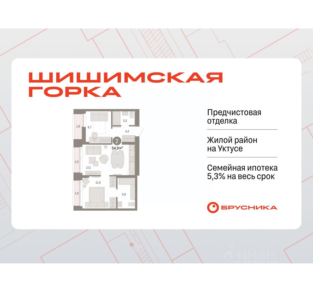 Квартира с кухней-гостиной и двумя спальнями в районе Шишимская горка. Особенности планировки: лоджия, разнесённые спальни, предчистовая отделка, мастер-спальня.