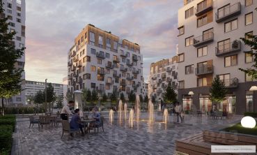 Оживлённое уличное движение останется за пределами квартала, а внутри создается собственная природная среда с зонами для вечерних прогулок, расслабленного отдыха, спорта и игр. Между домов проходит широкий пешеходный бульвар с разнообразным ландшафтом. Он объединяет общественные пространства между кварталами и переходит в площадь-сквер с фонтаном.
