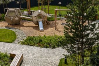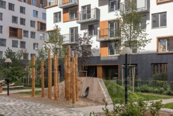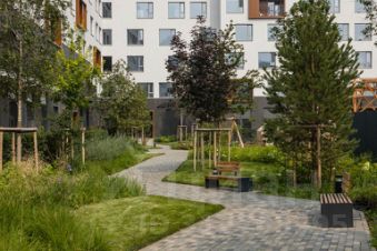 Проект благоустройства связывает приватные дворы кварталов, парковое пространство вокруг урбан-вилл, игровые комплексы для детей разных возрастов и спортивные площадки в единый ландшафт. Внутриквартальный двор тихий и спокойный. За счёт разной этажности и арок во дворе — много света. Здесь будет высажено до 40 видов растений — деревья, кустарники, цветы, злаковые травы и газон. Деревья привезут уже взрослыми со сформированной кроной. Растения цветут в разное время года, имеют разную плотность и высоту. Всё это сделано для того, чтобы двор был разнообразным и в каждое время года имел свой цвет.