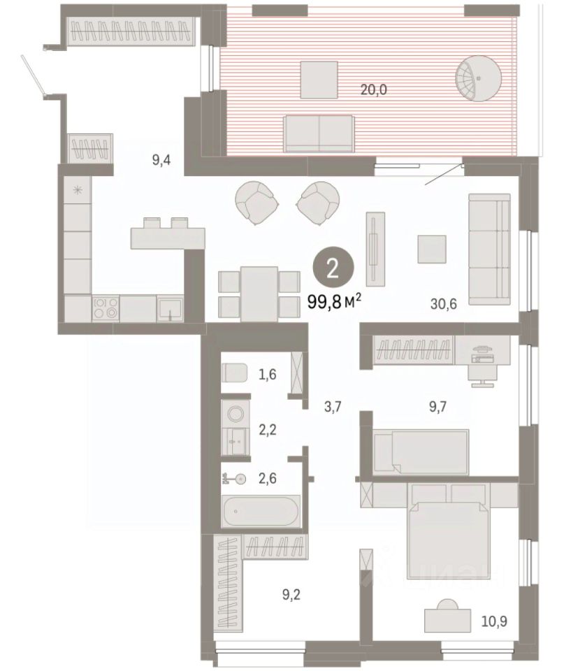 Квартира с кухней-гостиной и двумя спальнями в Северном квартале. Особенности планировки: второй санузел, гардеробная, вид во двор, предчистовая отделка, постирочная, терраса на крыше.
