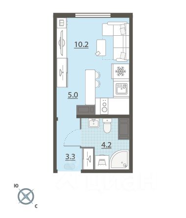 Жилая площадь 10.2 м2, кухня 5 м2, чистовая отделка. Раздельных санузлов - нет, балконов - нет, лоджий - нет.