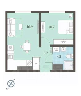 Жилая площадь 10.7 м2, кухня 16.9 м2, чистовая отделка. Раздельных санузлов - нет, балконов - нет, лоджий - нет.