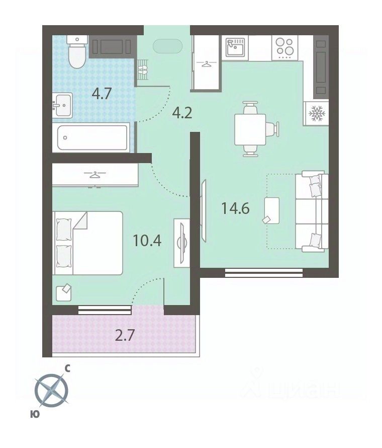 Жилая площадь 10.4 м2, кухня 14.6 м2, чистовая отделка. Раздельных санузлов - нет, балконов - нет, лоджий - нет.
