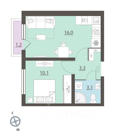 Жилая площадь 10.1 м2, кухня 16 м2, чистовая отделка. Раздельных санузлов - нет, балконов - нет, лоджий - нет.