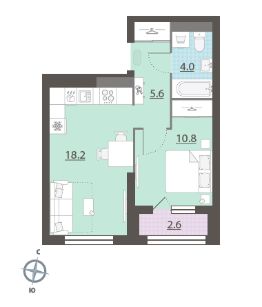 Жилая площадь 10.6 м2, кухня 17.8 м2, чистовая отделка. Раздельных санузлов - нет, балконов - нет, лоджий - 1.