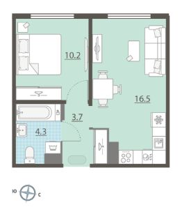 Жилая площадь 10.2 м2, кухня 16.5 м2, отделка под ключ. Раздельных санузлов - нет, балконов - нет, лоджий - нет.