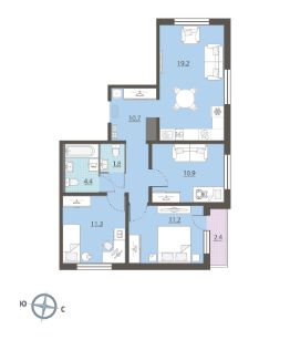 Жилая площадь 33.4 м2, кухня 19.2 м2, отделка под ключ. Раздельных санузлов - нет, балконов - нет, лоджий - 1.