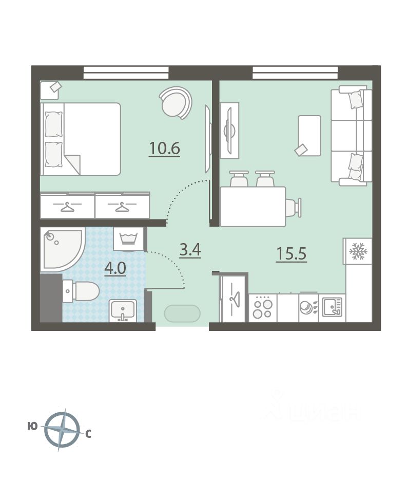 Жилая площадь 10.6 м2, кухня 15.5 м2, отделка под ключ. Раздельных санузлов - нет, балконов - нет, лоджий - нет.