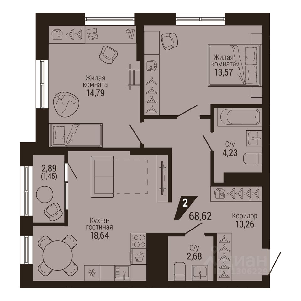 Общая площадь68,62 м²