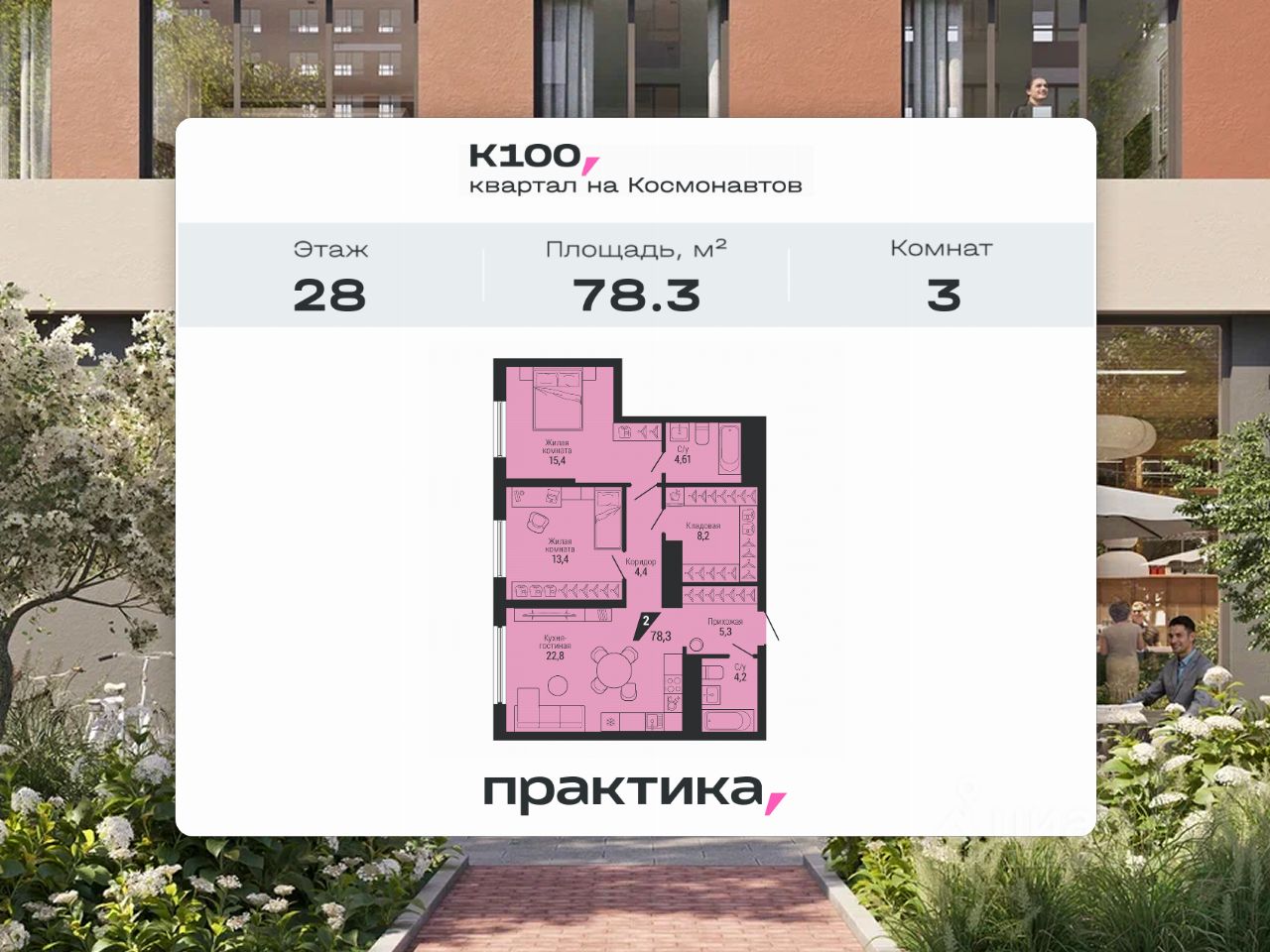 Жилой квартал "К100" на Космонавтов, 100 будет состоять из трех монолитно-кирпичных домов, объединенных общим двором. Застройщик компания "Практика". Планировки начинаются от 44,8 м² и доходят до 159,5 м². На каждом этаже располагается от восьми квартир классического и евроформата от двух до пяти комнат. Застройщик предлагает два вида отделки: white box и чистовую. Есть возможность перепланировки. Двор с ландшафтным озеленением разделен на три зоны. Для детей игровые площадки с меловыми досками и уличными шахматами, для взрослых лаунж-зона с креслами и столиками для отдыха, для спортсменов воркаут-площадка. На первом этаже лобби-клуб с игровыми комнатами, залом для йоги, коворкингом и мини-кинотеатром, колясочные и велосипедные помещения. Для автомобилистов предусмотрены гостевые места и подземный паркинг с доступом на лифте. На всей территории жилого комплекса установят видеонаблюдение. В доме будет работать консьерж-сервис в режиме 24/7. Дополнительные услуги включают клининг, выгул домашних животных, доставку еды из ресторанов и вызов такси. Также предусмотрена система "Умный дом". Рядом с жилым комплексом находятся сосновый бор, школы, детские сады, медицинские учреждения, торговые центры и супермаркеты, остановки общественного транспорта и станция метро. В шаговой доступности от дома откроется новый корпус уникальной гимназии "Арт-Этюд" — многопрофильного центра общего и художественного образования для детей от 3 до 18 лет. Строительство первой очереди жилого квартала "К100" на Космонавтов, 100 завершится в четвертом квартале 2026 года.