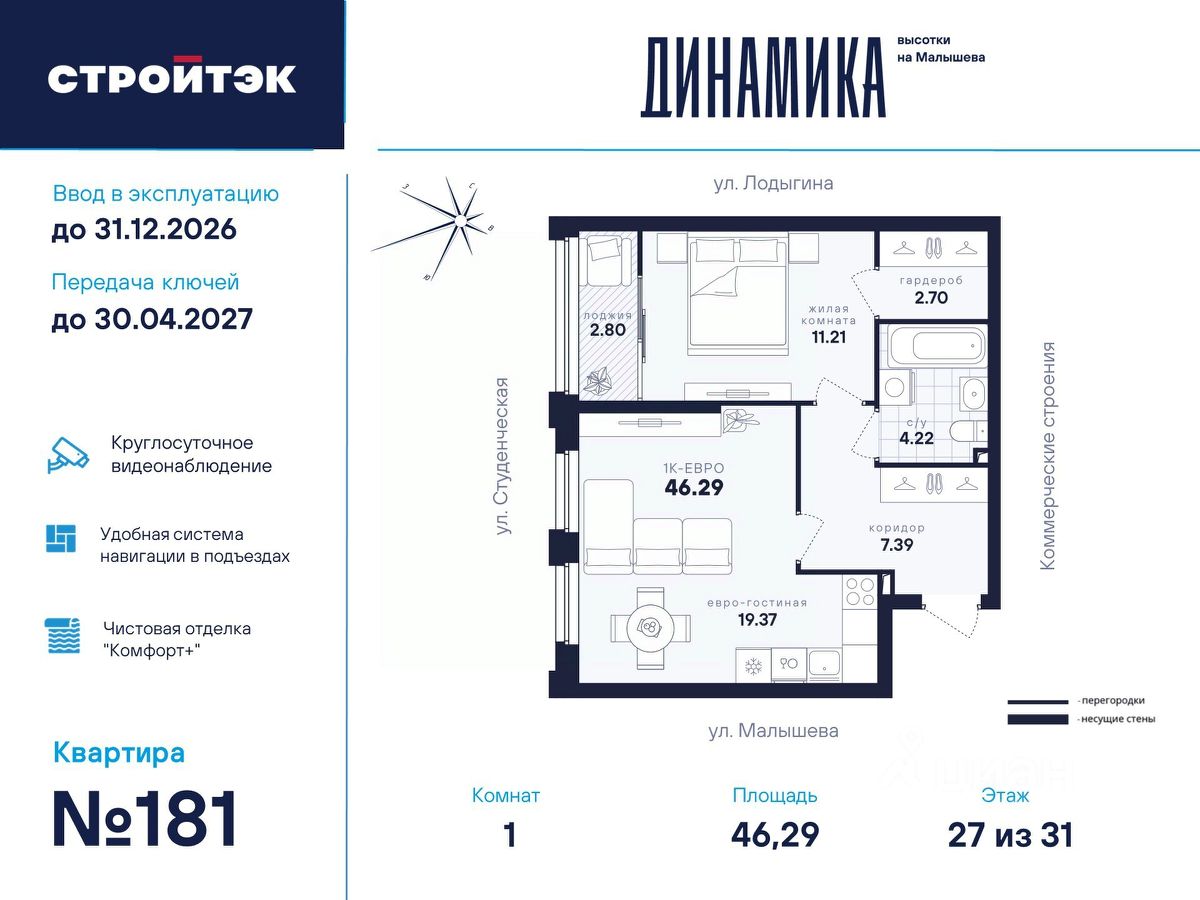 Настройте жизнь на максимум В Динамике воплощают мечты. Её фасады стремятся ввысь и рисуют силуэт ступеней — символа вашего движения, где всё задуманное сбывается. В интеллигентном микрорайоне Втузгородок всё под рукой. Пешком до остановки 5 минут, на машине до центра — 10. Соседство с торговыми комплексами и доступность ЕКАД входят в число преимуществ квартала наравне с близостью УРФУ, главных театров, филармонии, школ и детсадов. Рядом озеро Шарташ, которому около миллиона лет. Здесь катаются на сапах, лодках и катамаранах, а в Шарташском лесопарке вокруг озера — на велосипедах летом и лыжах зимой. Новое звучание района Выразительные башни Динамики притягивают взгляды издалека. Сплошные стеклянные витражи фасадов меняют восприятие проекта в зависимости от ракурса, времени года и суток. В квартирах с витражным остеклением алюминиевые оконные рамы и широкие подоконники визуально увеличивают пространство. Благодаря современным технологиям витражи обеспечивают дополнительную теплоизоляцию, помогая сохранять комфортный микроклимат в квартире и летом, и зимой. Отдых в вашем ритме Выбирайте досуг по душе для себя и семьи. Занимайтесь на тренажёрах и воркаут-комплексе, играйте в пинг-понг, футбол или баскетбол. Для детей — насыщенный плейхаб, который тренирует тактильность и равновесие в атмосфере безопасности и контролируемого риска. Размеренно прогуливайтесь меж декоративных холмов, под тенистыми навесами-перголами вблизи удобных скамеек. СТРОЙТЭК возводит Динамику в 3 этапа. Первый этап строительства Секция 1 — башня в 31 этаж. В ней 209 1- и 2-комнатных квартир и 21 уникальная планировка — как в классическом исполнении, так и с просторными кухнями-гостиными до 22 м квадратных. Мы сдадим дом в 4 квартале 2026 года и выдадим ключи не позднее 30 апреля 2027 года. В подъезде вас встретят просторные светлые холлы с уютным минималистичным дизайном бизнес-класса, комфортные помещения для колясок и самокатов, а также 3 надёжных лифта на 1 000 кг каждый. Живите легко — мы об этом уже позаботились. Автономная газовая котельная позволит не зависеть от центрального отопления, а закрытый паркинг на 82 места внутри стилобата с подъёмом до этажа избавит от лишней суеты. Технологии комфорта Обратите внимание на планировки с гардеробными и тёплыми лоджиями, где 5-камерный ПВХ-профиль заботливо защитит от непогоды. И особенно — специальный формат квартир с террасами на 2 этаже: здесь так приятно проводить время с гостями, загорать на шезлонгах или ужинать при свечах. В Динамике улучшенный стандарт отделки "Комфорт+". Помимо привычных сантехники и электрики, в него входят оконные стёкла Energy Light, которые помогают сохранять комфортную температуру, приточные клапаны вентиляции Air-Box и детские замки, особо прочный ламинат 33 класса и устойчивые к многократной покраске виниловые обои. Белые межкомнатные двери и плинтусы лаконично подчеркнут любую цветовую гамму, а надёжная сейф-дверь добавит спокойствия и беззаботных моментов.