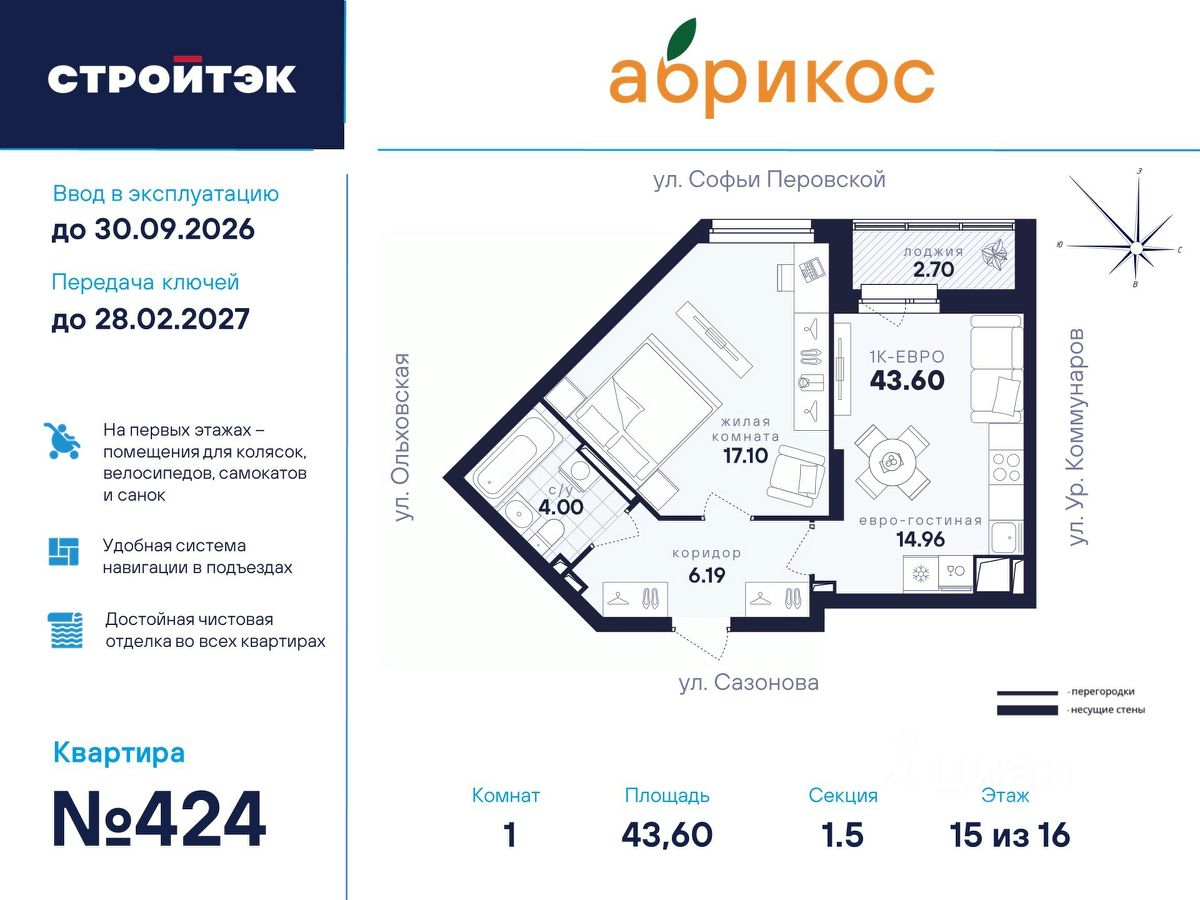ЖК "Абрикос" ЖК "Абрикос", расположен в районе Новая Сортировка по адресу ул. Софьи Перовской, д. 106а. Познакомьтесь с "Абрикосом" поближе. Мы создали его таким, чтобы вы были довольны всем, а ваша жизнь в нём была как сам этот фрукт: свежей, сочной, яркой и солнечной. Район Тихий микрорайон Новая сортировка на Северо-западе Екатеринбурга. 20 минут пешком до парка "Таганская слобода" 15 минут на машине до кольцевой дороги, а до центра — полчаса даже по пробкам 10 минут на машине до ТЦ "Карнавал" 7 школ и 11 детсадов поблизости 6 продуктовых магазинов рядом Двор Во дворе хорошо должно быть всем: детям — площадки по возрасту, взрослым — прогулочные дорожки. Но это не всё. Вместительная парковка вокруг ЖК Концепция "Двор без машин", когда можно заехать только для разгрузки и погрузки Закрытая территория с пропускной системой Круглосуточное видеонаблюдение и освещение территории в ночное время Стритбольная площадка Подъезды Не подъезд, а парадная. Так говорят в Петербурге, но и в "Абрикосе" это слово приходит в голову. Просторные холлы с витражами и достойной отделкой. Доступ в подъезды на уровне земли — без барьеров Домофоны — в тёплых остеклённых тамбурах В каждом подъезде — грузопассажирский лифт Помещения для колясок и самокатов на 1 этаже Удобная навигация с номерами этажей и квартир Планировки Наш подход к проектированию называется "Разумные метры". Это значит не только исходить из площади, но и учитывать число жильцов и их потребности. Объединённые кухни-гостиные для простора и общения 3D-модели с вариантами обстановки Отказ от бесполезных "мёртвых" зон Отделка В ЖК "Абрикос" мы позаботились о чистовой отделке, чтобы ваш переезд прошёл быстро и не вызвал лишних хлопот. На полу в комнатах, прихожих и кухнях — прочный водостойкий ламинат, в санузлах — керамическая плитка, потолки — натяжные Межкомнатные двери и усиленная сейф-дверь на входе в квартиру В санузлах установлены раковины и унитазы, а во всей квартире — розетки и выключатели Радиаторы с терморегуляторами и горизонтальной разводкой, двухкамерные стеклопакеты с приточными клапанами вентиляции