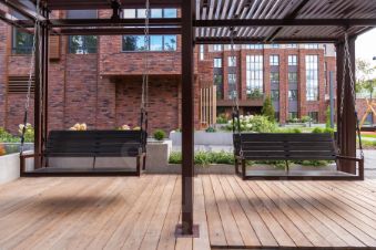 Тихое течение реки в непосредственной близости от дома умиротворяет и дает возможность построить концепцию двора в стиле регулярных садов. Простая геометрия и функциональное распределение детских игровых и развивающих зон и уютных беседок для взрослых все это восстанавливает силы и душевное равновесие после напряженных рабочих дней.