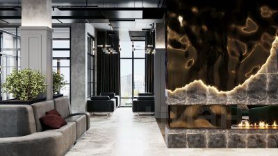 Дизайн холлов раскрывает характер клубного дома он выполнен в современном стиле необрутализма, и дает возможность резидентам проводить деловые встречи, организовывать собрания при этом благодаря своим цветовым и световым решениям создает настрой на спокойный тон. Двусторонний камин придает уют и при этом эффективно зонирует общее пространство холла. Лобби стоит отметить отдельно его окна выходят во двор, и можно уютно устроившись с кофе за столиком, наблюдать за детьми на детской площадке или просто любоваться благоустройством.