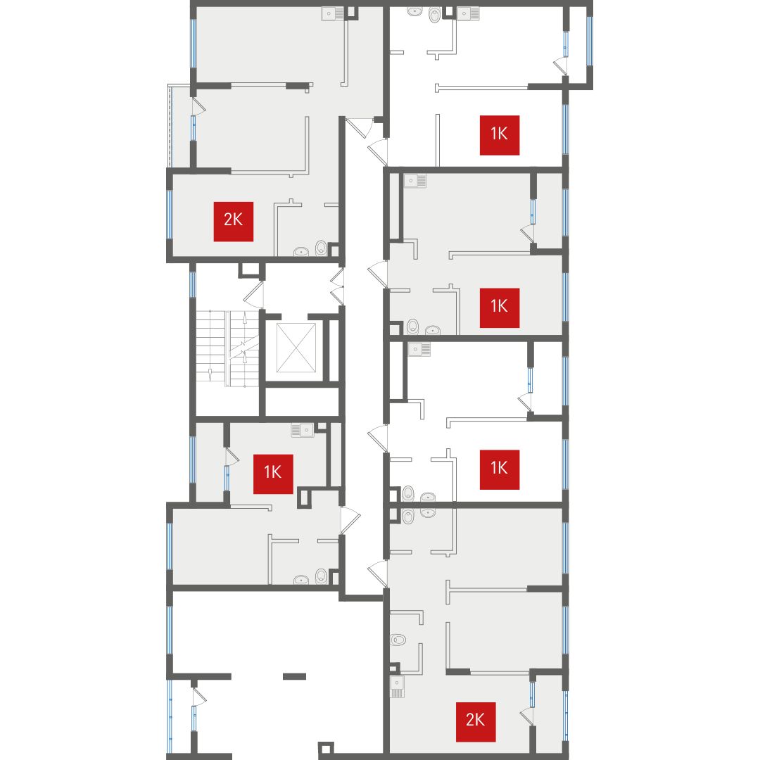 Отделка под чистовую. В санузле — монолитный потолок, на полу — гидроизоляция и стяжка, стены оштукатурены. В одном санузле установлены унитаз и раковина. В остальных помещениях потолок — монолит, на полу — стяжка, стены оштукатурены.