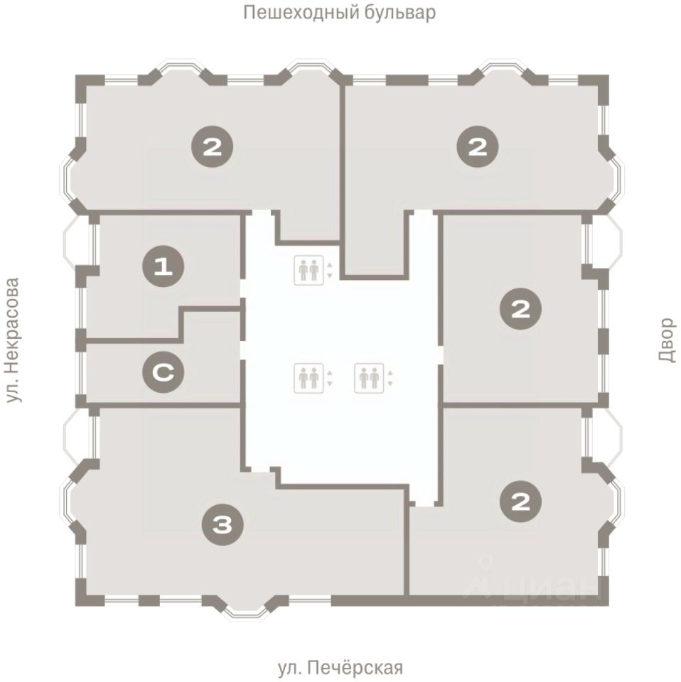 Квартира с кухней-гостиной и двумя спальнями в квартале "На Некрасова". Особенности планировки: второй санузел, гардеробная, вид во двор, лоджия, разнесённые спальни, предчистовая отделка, мастер-спальня.