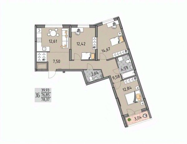 Продаётся 3-комнатная квартира в строящемся доме (Дом 1.1), срок сдачи: IV-кв. 2026, общей площадью 78.37 кв.м., на 9 этаже.