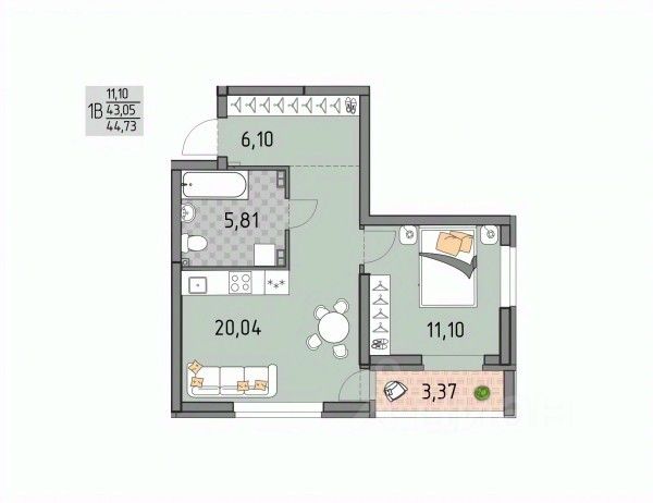 Продаётся 1-комнатная квартира в строящемся доме (Дом 1.1), срок сдачи: IV-кв. 2026, общей площадью 44.735 кв.м., на 14 этаже.