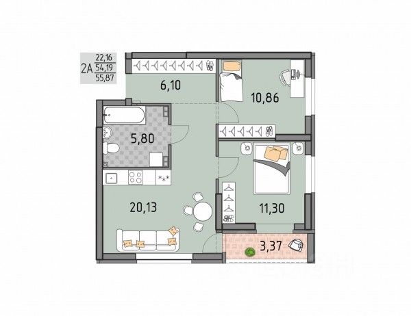 Продаётся 2-комнатная квартира в строящемся доме (Дом 1.1), срок сдачи: IV-кв. 2026, общей площадью 55.875 кв.м., на 11 этаже.