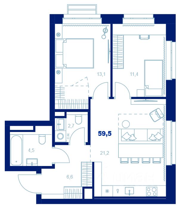 Общая площадь59,5 м²