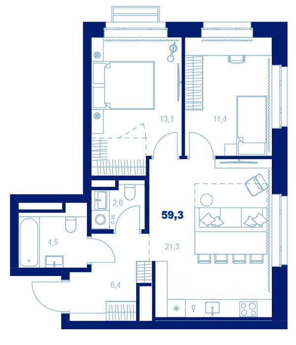 Общая площадь59,3 м²