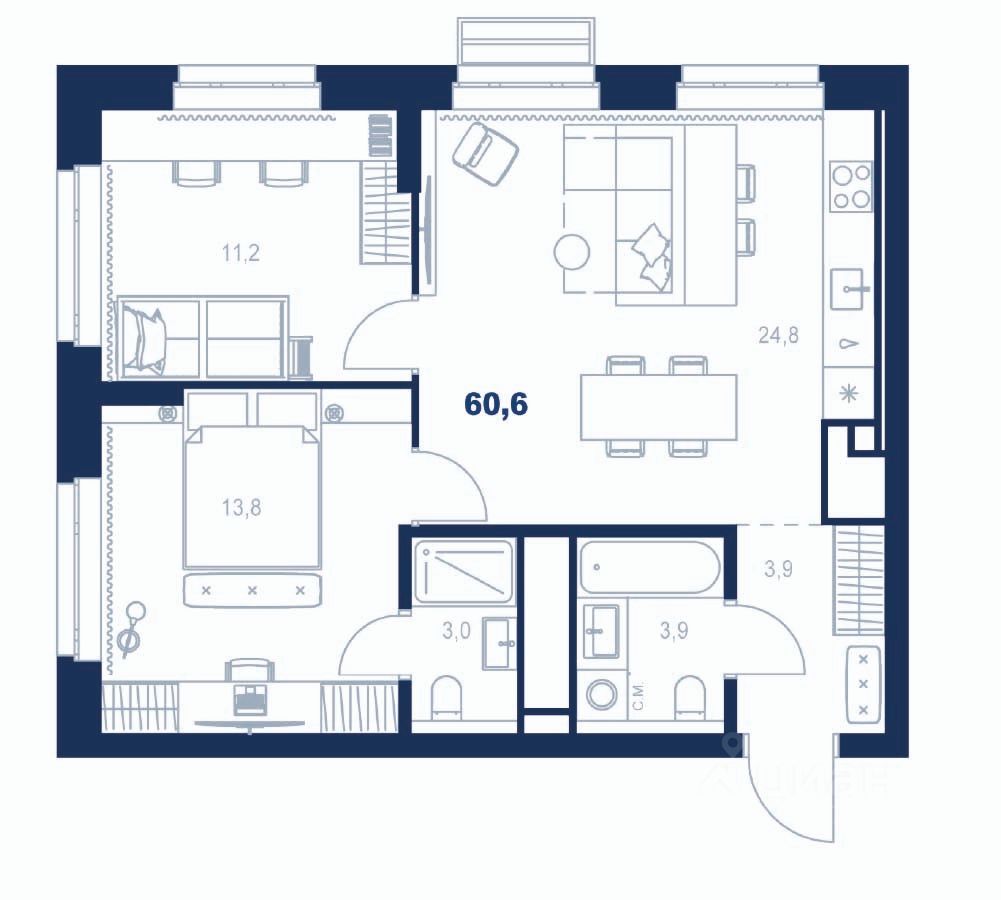 Общая площадь60,6 м²