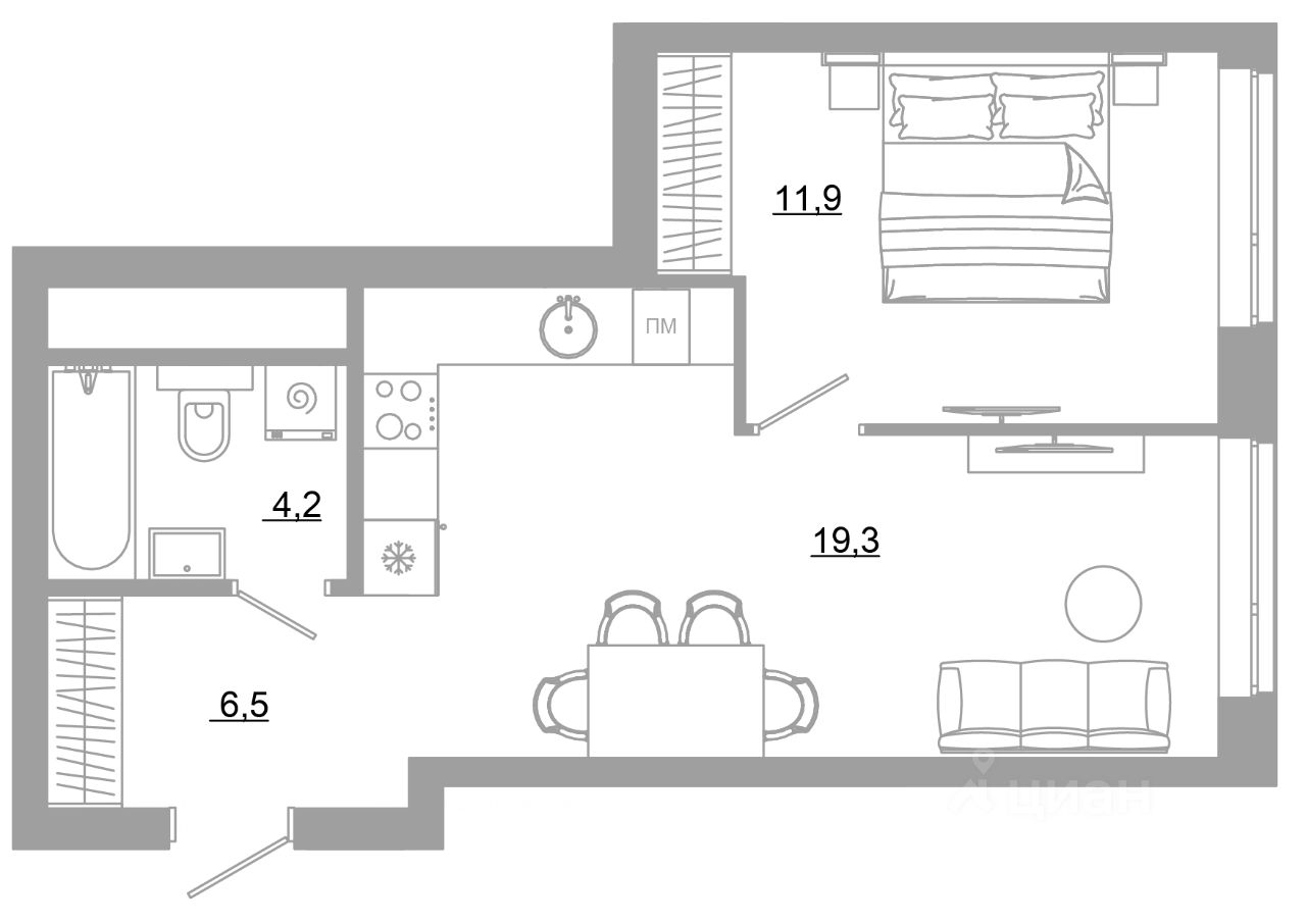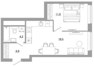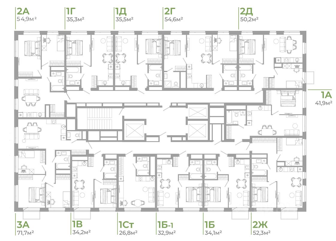 В комплексе представлены десятки планировок с площадью квартир от 26,24 м² до 66,58 м². Каждая учитывает сценарии жизни, эргономичность и функциональность каждого квадратного метра.