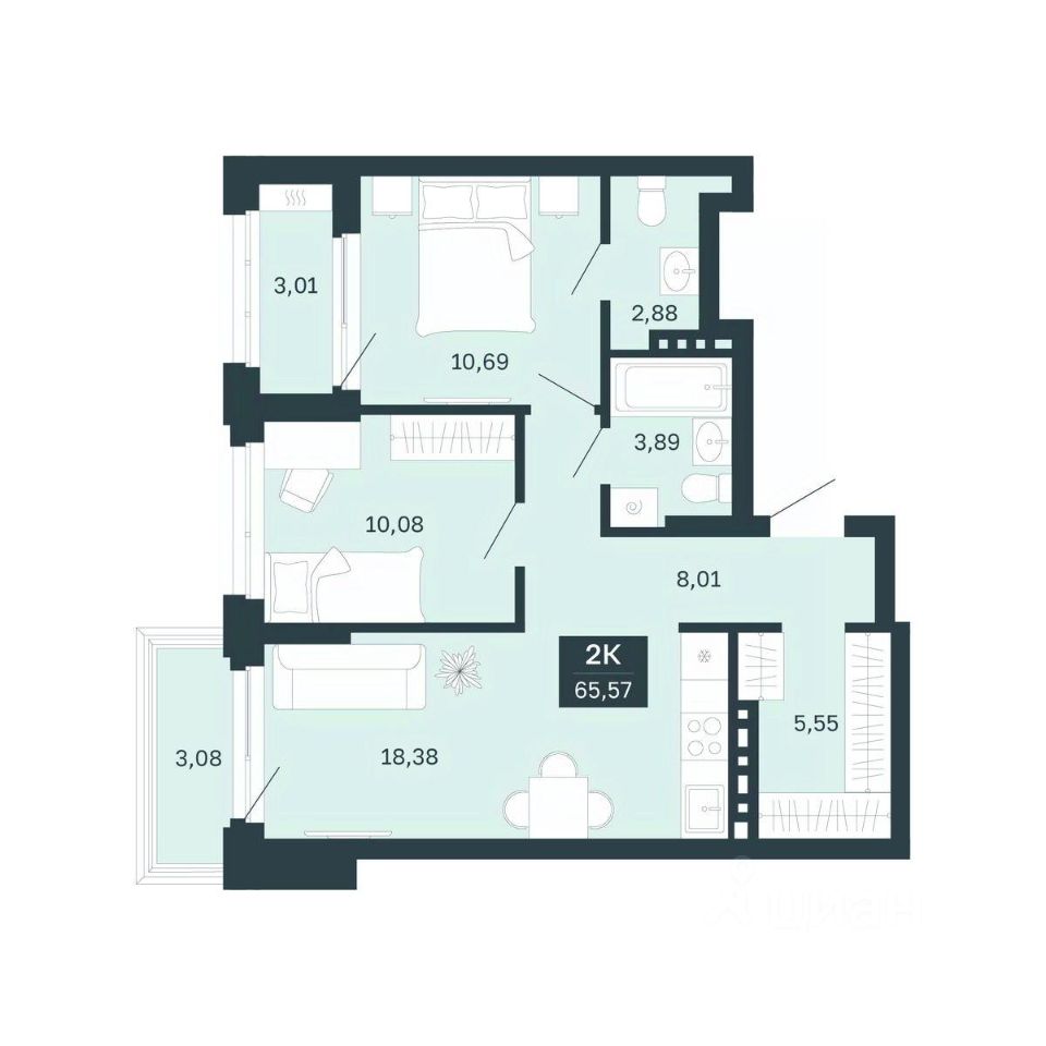Продаётся 2-комнатная квартира в строящемся доме (Секции 1-4), срок сдачи: II-кв. 2027, общей площадью 65.57 кв.м., на 6 этаже. Новый жилой комплекс "Сибирская калина" от застройщика "СЗ Атлант-Екатеринбург" расположен по адресу: г. Екатеринбург, улица Титова.