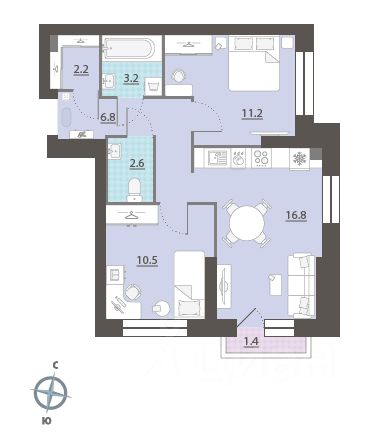 Жилая площадь 21.7 м2, кухня 16.8 м2, чистовая отделка. Раздельных санузлов - нет, балконов - 1, лоджий - нет.