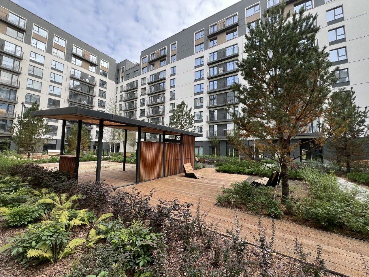 Двор закрыт для въезда машин. Его пространство разделено на несколько зон. В одной расположены детские площадки с качелями, искусственными холмами и горкой. Игровые элементы на них сделаны из дерева: зимой оно не промерзает, а летом не накаляется на солнце. В другой - фонтан и места, где можно в тишине почитать и отдохнуть. В третьей установлены уличные тренажеры для занятий спортом.