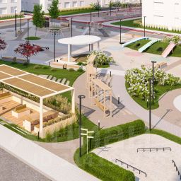 - Закрытая придомовая территория, детская площадка, спортивная площадка.
