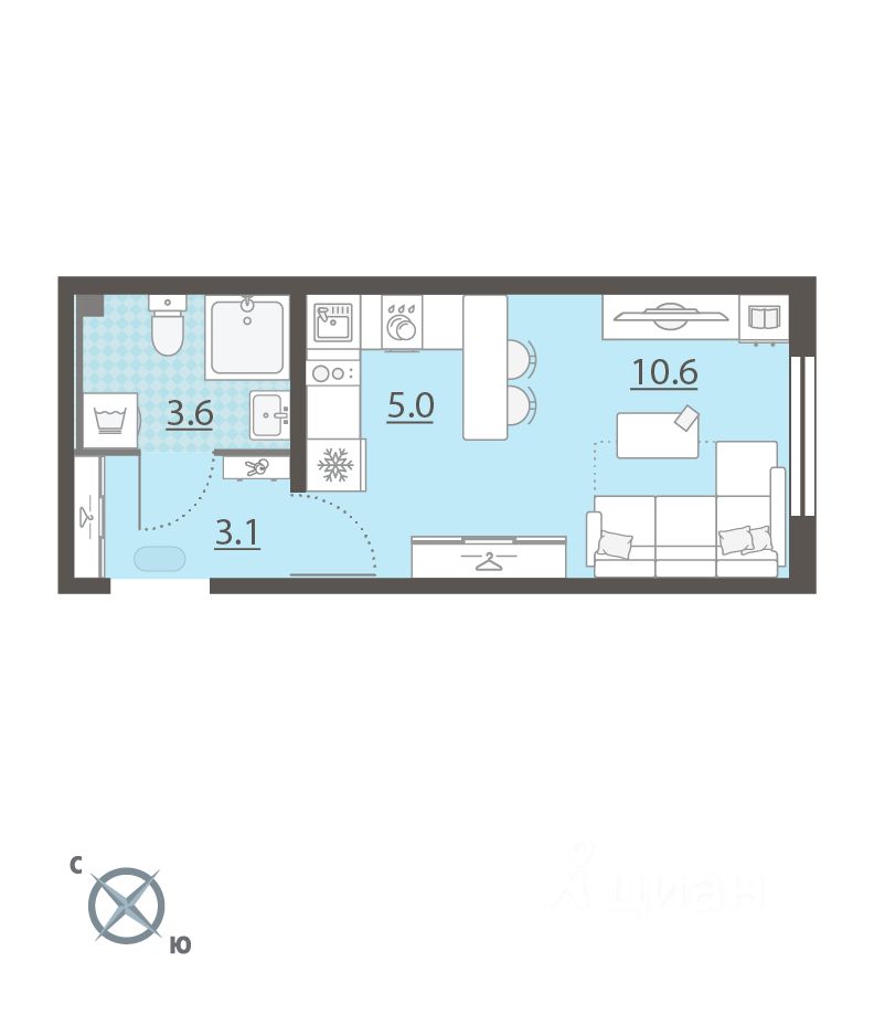 Жилая площадь 10.6 м2, кухня 5 м2, чистовая отделка. Раздельных санузлов - нет, балконов - нет, лоджий - нет.