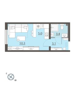 Жилая площадь 10.3 м2, кухня 5 м2, чистовая отделка. Раздельных санузлов - нет, балконов - нет, лоджий - нет.