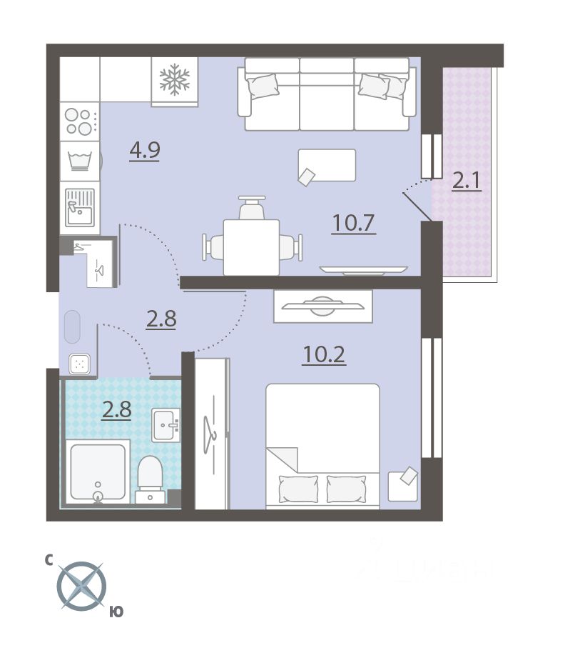 Жилая площадь 20.9 м2, кухня 4.9 м2, чистовая отделка. Раздельных санузлов - нет, балконов - нет, лоджий - 1.