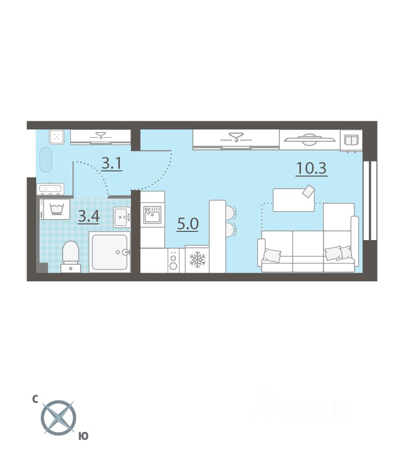 Жилая площадь 10.3 м2, кухня 5 м2, чистовая отделка. Раздельных санузлов - нет, балконов - нет, лоджий - нет.