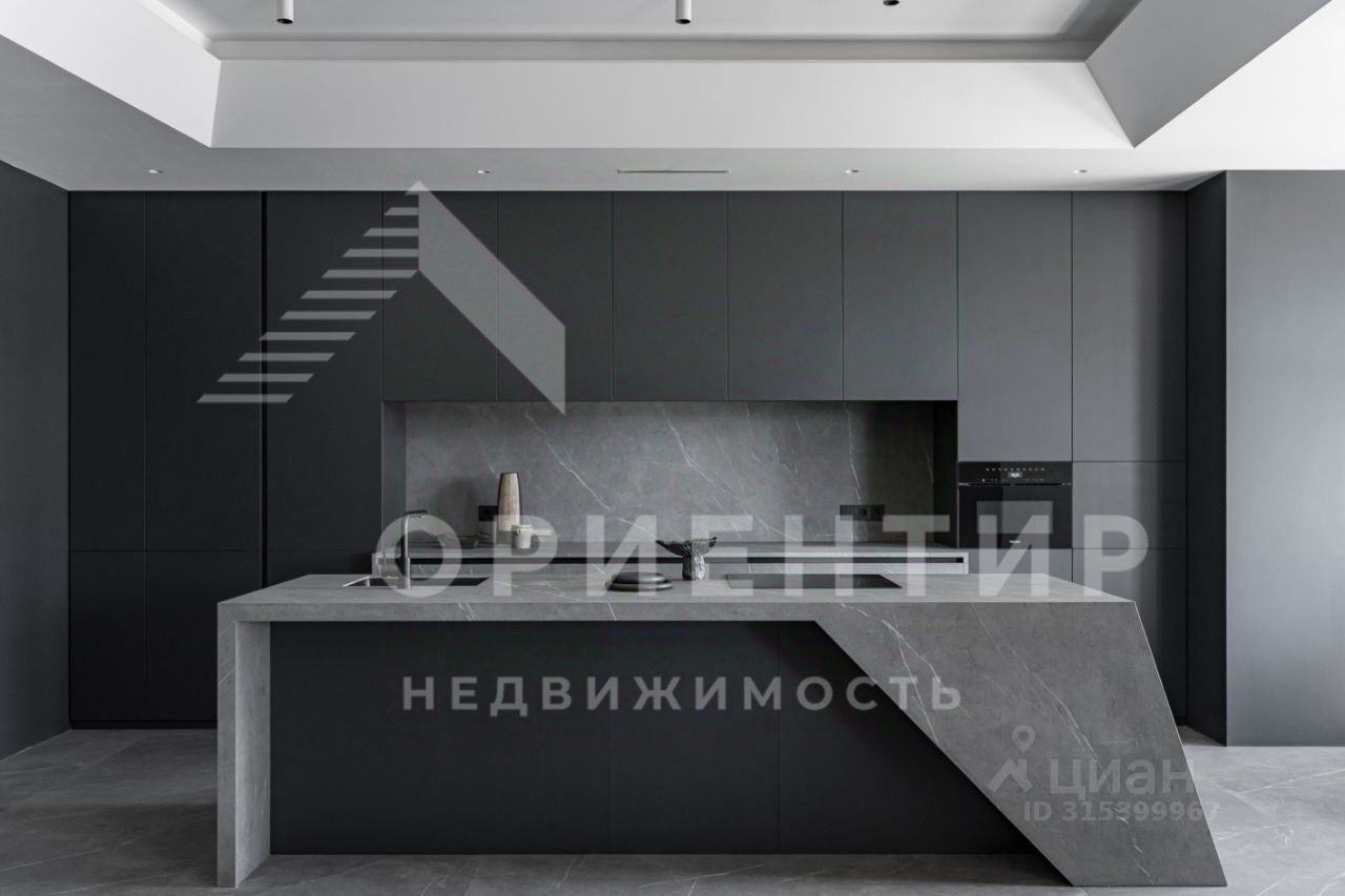 Нам кухне установлен скульптурный остров. С одной стороны функциональные шкафы для хранения, с другой как барный стол. Техника Miele.