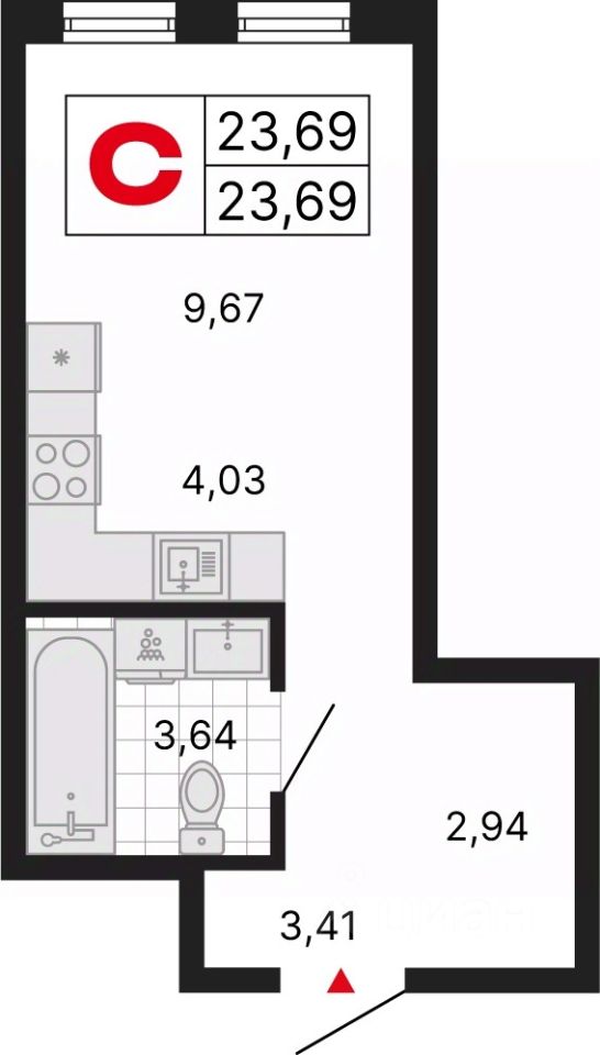 Просторная 1-комн. квартира-студия с отделкой в ЖК "ДНК. Дом на Куйбышева" на 18 этаже. Общая площадь: 23.69 кв.м., площадь гостиной 13.73 кв.м., из которых 4.03 кв.м. выделено под кухонную зону. Все окна выходят на одну сторону. В квартире один совмещенный санузел. Высота потолков 2.7 м.