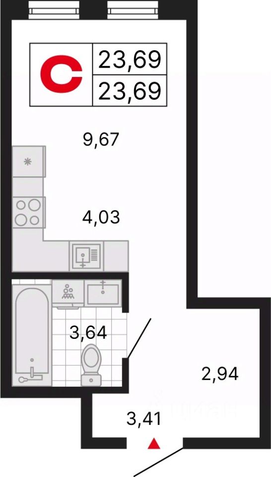 1-комн. квартира-студия от застройщика с отделкой в ЖК "ДНК. Дом на Куйбышева" на 21 этаже. Общая площадь: 23.69 кв.м., площадь гостиной 13.73 кв.м., из которых 4.03 кв.м. выделено под кухонную зону. Все окна выходят на одну сторону. В квартире один совмещенный санузел. Высота потолков 2.7 м.